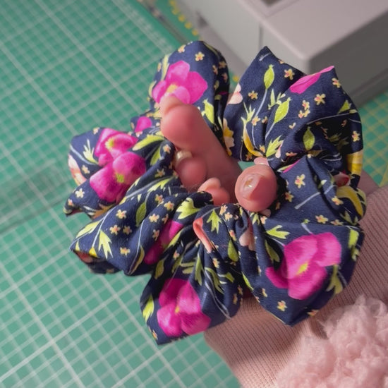The Misty Bloom Large Scrunchie is a stylish, comfortable designed to elevate your everyday hairstyles. Featuring a deep navy background with delicate botanical details, this large fabric scrunchie adds volume and a soft statement to ponytails, buns, and wrist wear.